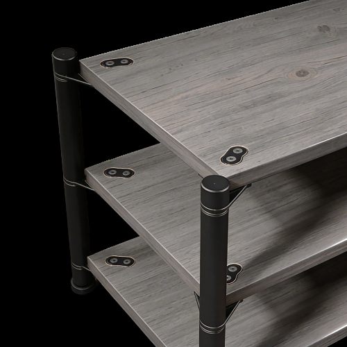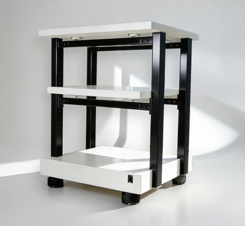 Franc Audio Accessories 15th Anniversary Rack with 3 component shelves in white with black railing.